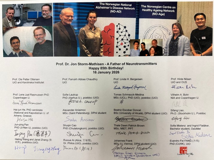 On the 19th January 2026, we had a celebration to Prof. Dr. Jon Storm-Mathisen’s 85th birthday: a Father of Neurotransmitters. We wish you a happy, healthy, and active 2026 and onwards. We look forward to celebrating your 90th birthday!